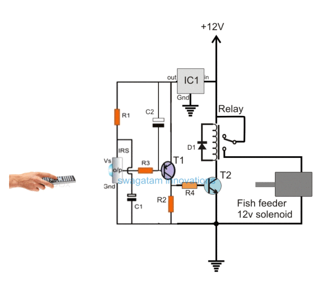 ▲ 图1.4.3 一个使用红外接收光电管控制继电器进行鱼食投喂电路