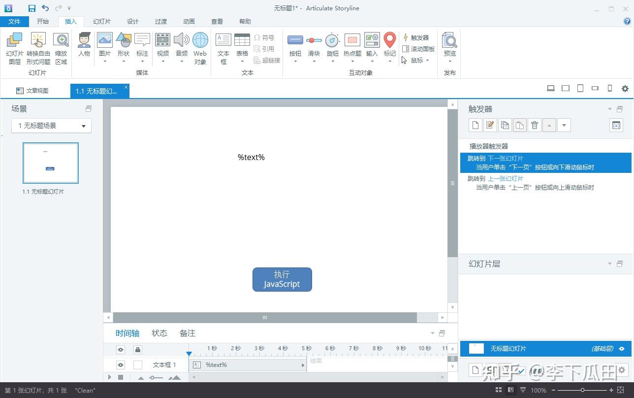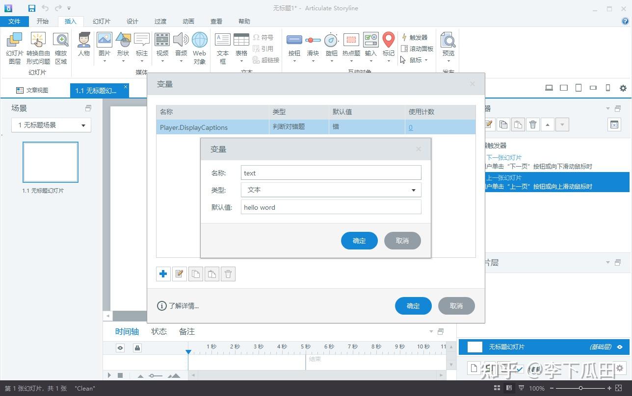 1.在storyline中添加变量:text,默认值设为:hello word。