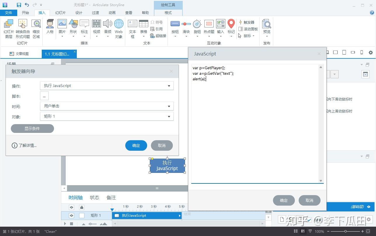 var p=GetPlayer();var a=p.GetVar("text");alert(a);4.发布,看看执行效果。